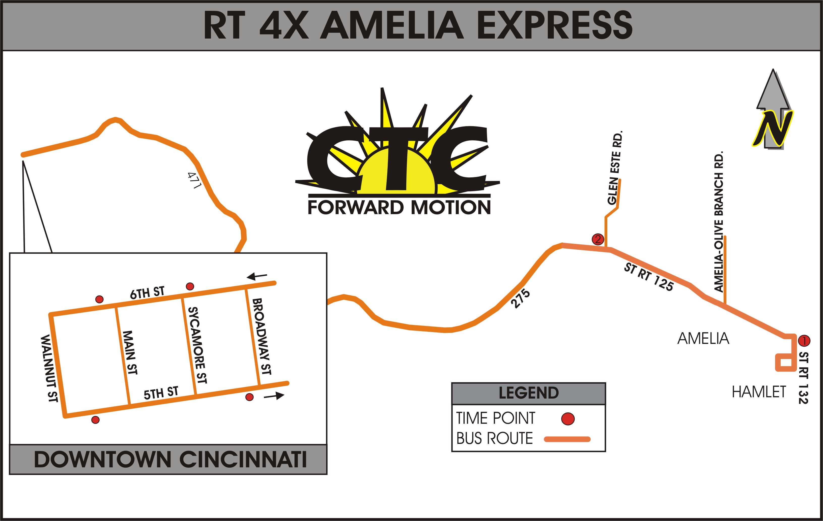 Route 4X provides non-stop express service from the Amelia area to downtown Cincinnati. The route has 4 bus stops in downtown (see details below) and over 30 stops along 125 (just look for the “Bus Stop” sign.)